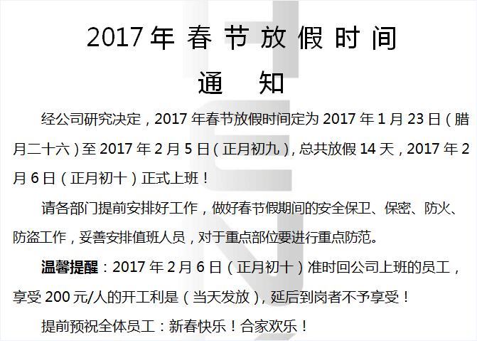 春節(jié)即將來臨,漢高機械決定在2017年1月23號開始放春假,有關(guān)各種業(yè)務(wù)的客戶請注意請注意請注意,為避免假期期間可能造成不必要的損失,請?zhí)崆鞍才藕霉ぷ鳎匾氖虑檎f三遍!