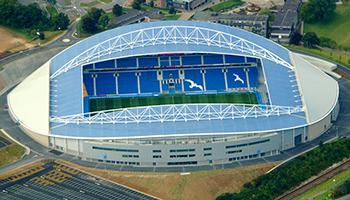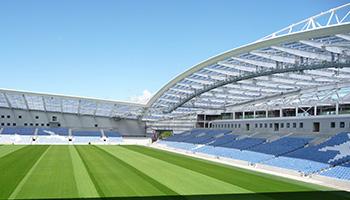 布賴頓社區(qū)球場開放于2011年5月。從開始時起,該球場的設(shè)計就留有擴建余地,并且早在2011年12月,就制定了擴建計劃。2012年初,布賴頓獲得規(guī)劃許可,并且在2012-13賽季開始之前,新增5,000個座位,在2013年初,再次增加3000個座位,這使得該球場的容量增至3.05萬個座位。該球場的主要特征是宏偉的波浪拱形鋼制頂棚結(jié)構(gòu),該設(shè)計意在襯托周圍的石灰?guī)r山巒。主看臺上方的頂棚是半透明的天藍(lán)色,再加上可以反光的銀色墻面覆層,進(jìn)一步強化了自然光線。由于采用最新設(shè)計,頂棚重量僅為101千克/平方米,從而成為這種形式的大跨度頂棚的行業(yè)標(biāo)桿。該球場在設(shè)計上達(dá)到最高環(huán)保標(biāo)準(zhǔn),獲得BREEAM(英國建筑研究院環(huán)境評估方法)“非常好”評級。這一點的實現(xiàn)有賴于三點:通過減少建筑材料的數(shù)量,盡量減少二氧化碳排放量;優(yōu)化絕緣標(biāo)準(zhǔn);以及盡量減少能源消耗和廢物產(chǎn)生。整個球場共用去4200噸結(jié)構(gòu)鋼材(2011年數(shù)據(jù))。