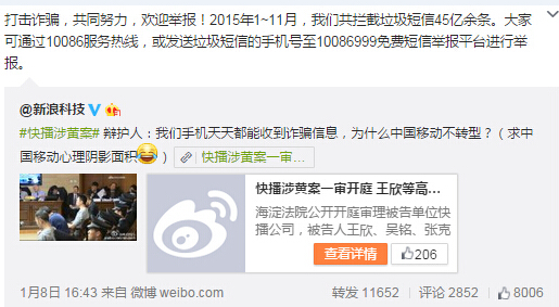 除了互聯(lián)網(wǎng)巨頭,中國移動也成為快播辯護人用來反駁的說辭。王欣辯護律師稱:“公訴人老是問快播為什不轉(zhuǎn)型?那就我問問,我們手機里老是收到詐騙短信,怎么沒讓中國移動轉(zhuǎn)型???”此話一出,嚇得中國移動趕忙發(fā)微博: