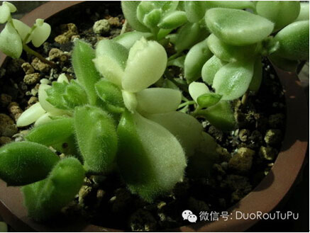 6. 錦:肉肉顏色上的一種變異,多呈現(xiàn)出黃色、白色或粉色?;旧蠒?huì)在名字后面加一個(gè)錦字,如XX錦,帶個(gè)錦的很難得,一般出錦之后就會(huì)身價(jià)倍增。如下圖熊童子白錦。